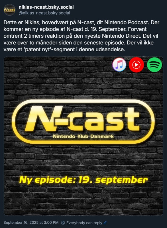 Der er desværre ingen episode af N-cast i denne uge, grundet travlhed hos alle 3 værter! Men vi vender stærkt tilbage med snak om Nintendos kvartalsregnskab og nyt om Nintendo Switch 2 i næste uge! God weekend!#2 - Skrevet 16-09-2025 15:20 - Redigeret 16-09-2025 15:25